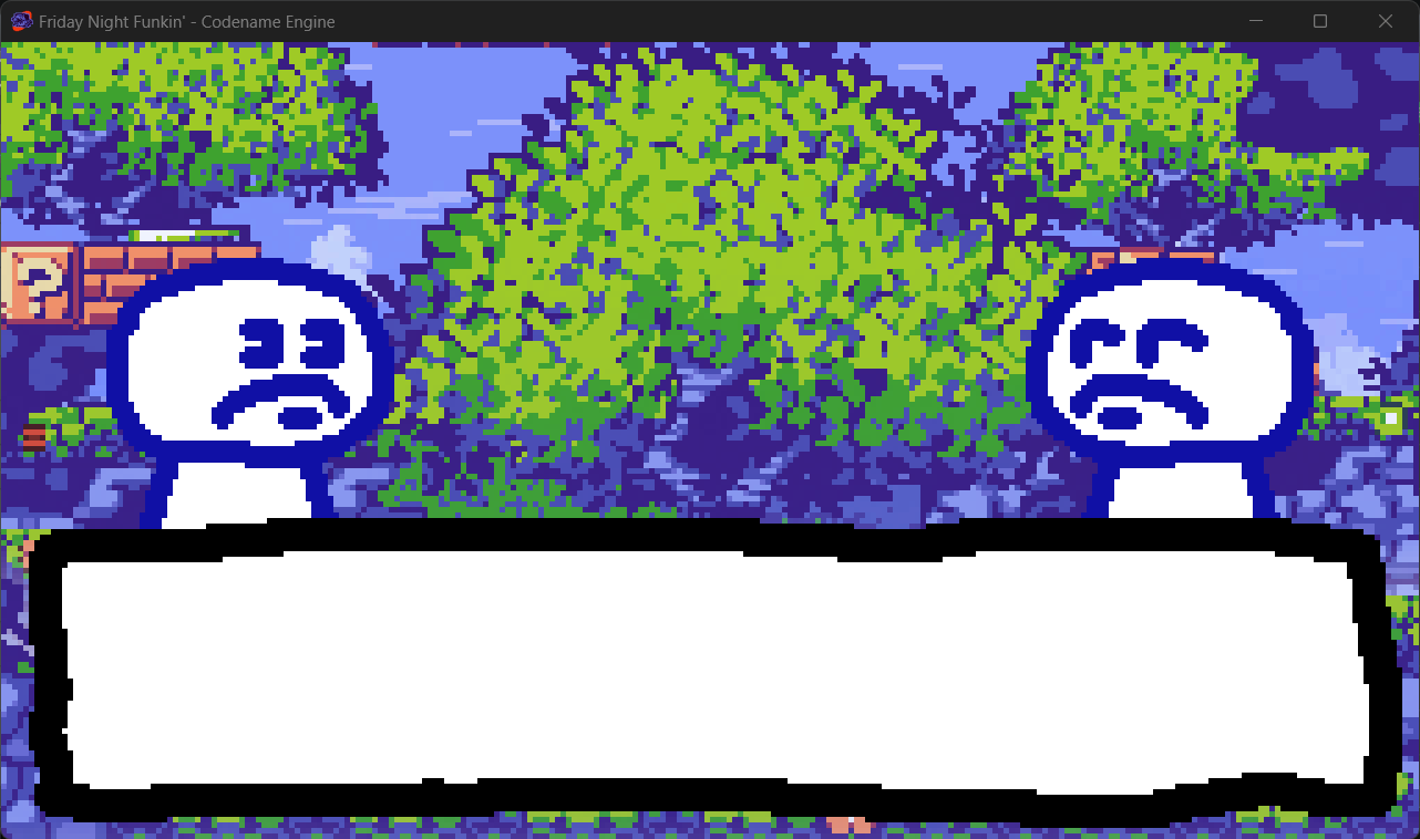 Added this on June 16th. In addition to intro cutscenes, we will have dialogue at the beginning of the main week songs, since having dialogue within the videos themselves isn't the best idea since some people might not be able to read it. I'm a fan of these placeholder people, anyway.